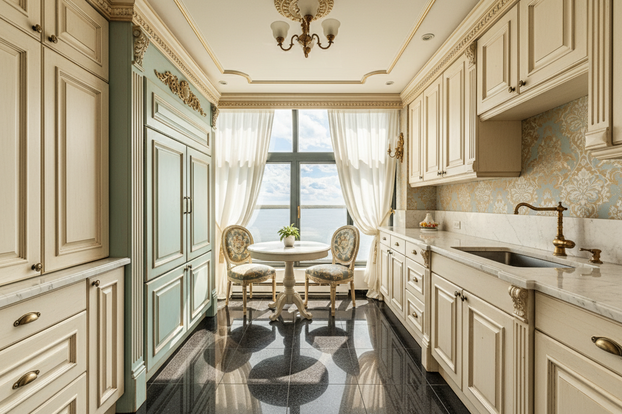 The kitchen blends craftsmanship and softness. Custom cream cabinetry, marble countertops, brushed brass fixtures, and subtle blue accents introduce a gentle contrast that feels curated and intentional. Sheer drapery filters natural light, allowing the skyline and water to remain the true backdrop.