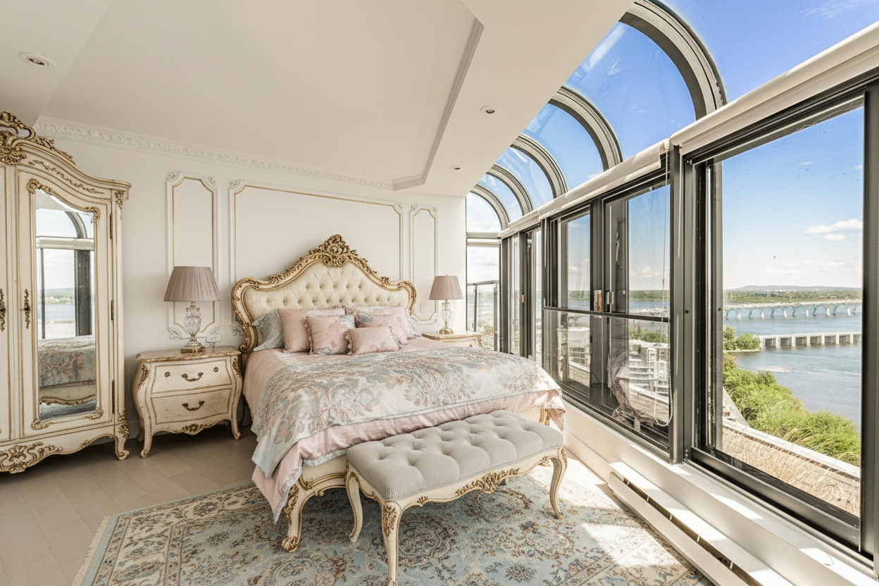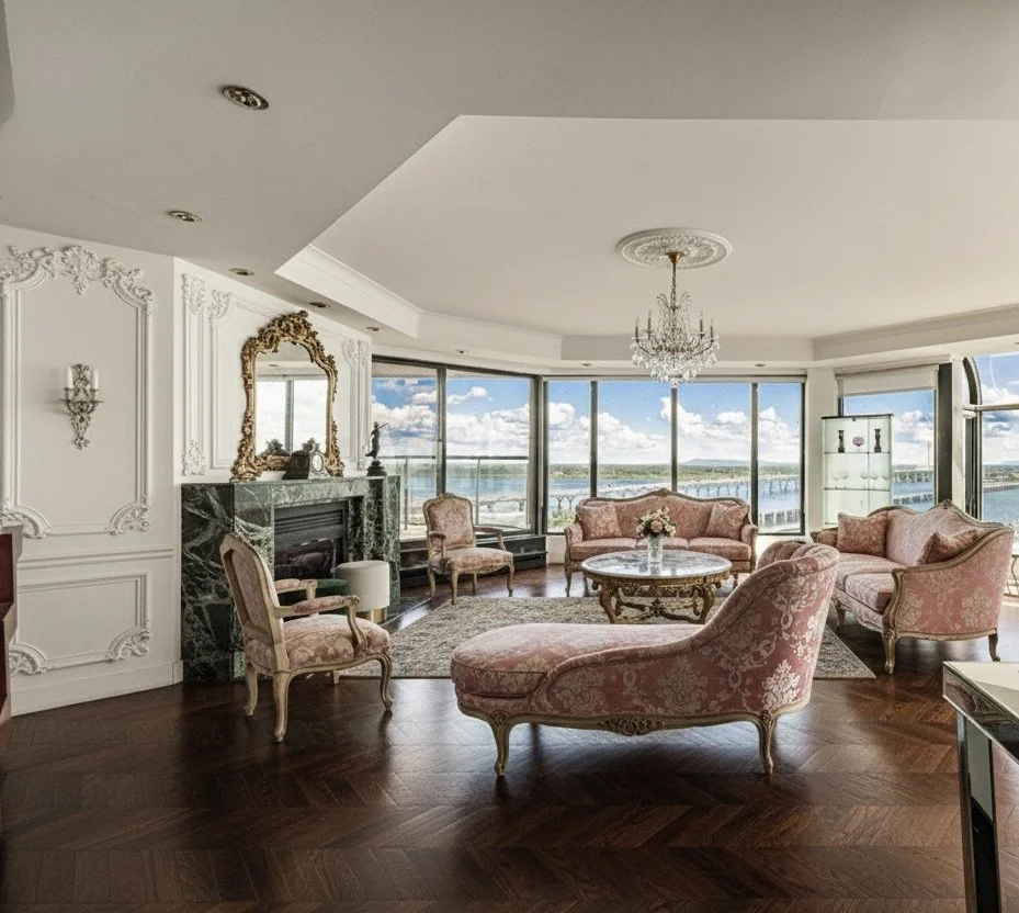 Blush Horizon is a light-filled penthouse overlooking sweeping water views, where classic detailing meets elevated modern living.
