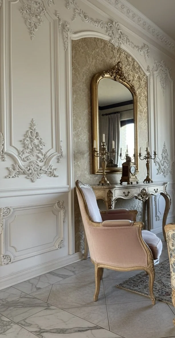 The color story centers around soft rose tones and warm neutrals, grounded by creamy whites and natural stone. Ornate wall moldings, decorative paneling, and classic European detailing set the architectural foundation, giving the home a sculptural presence. Antique gold and aged brass accents are used throughout to add warmth and depth without overpowering the softness of the palette.