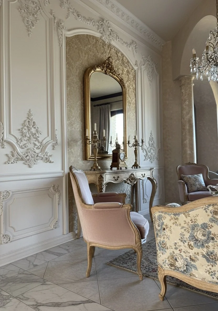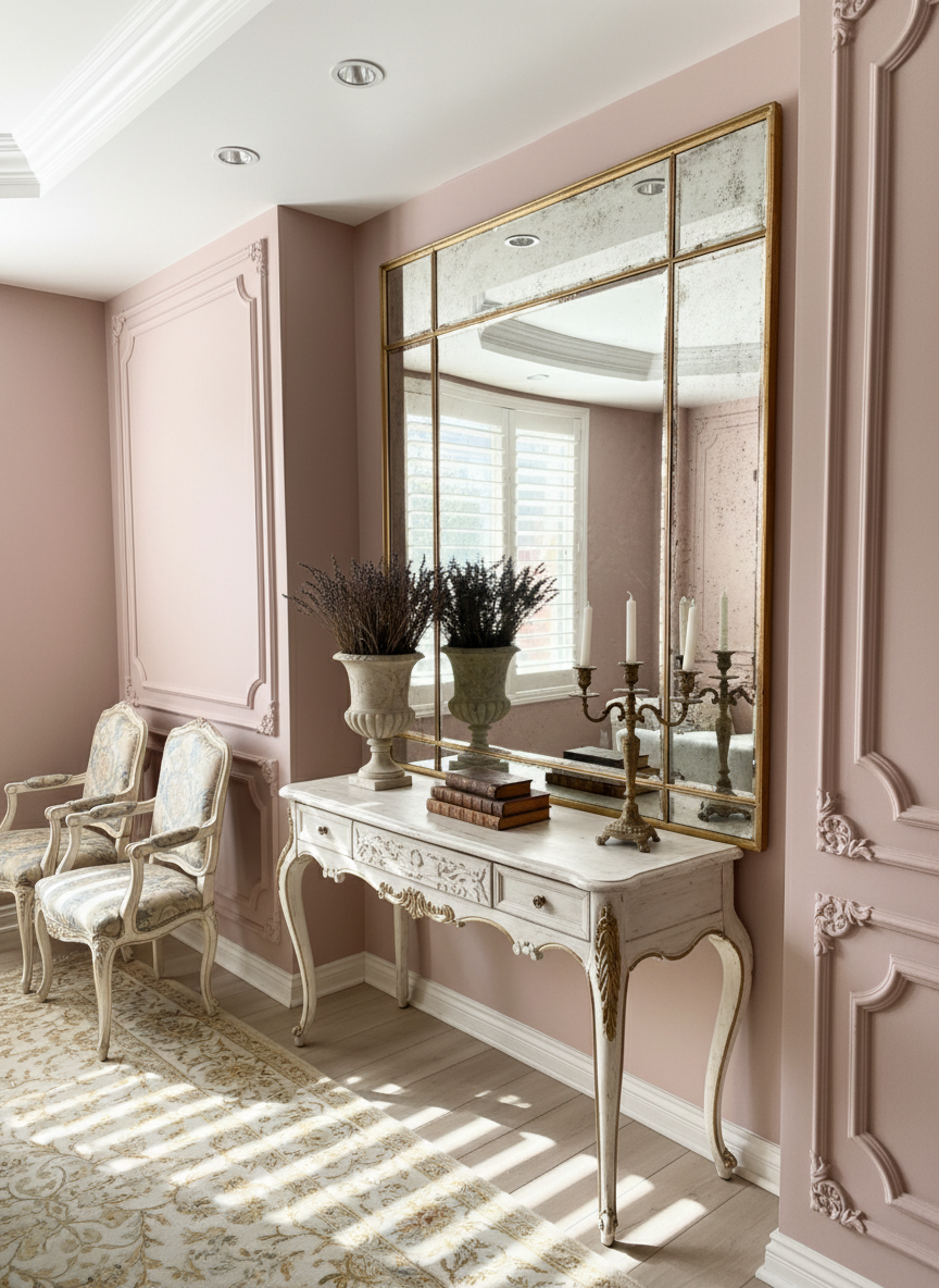 The Rose Gallery is an intimate transitional space defined by muted blush walls and delicate architectural detailing. A vintage-inspired mirrored installation reflects light throughout the room, enhancing its softness and depth.